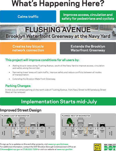 Construction will start Saturday, July 17th on the addition of bike lanes to Flushing Avenue. This will reduce the travel lanes to one lane in each direction, and result in the removal of on-street parking on the NORTH side of Flushing (from Navy to Williamsburg Streets).