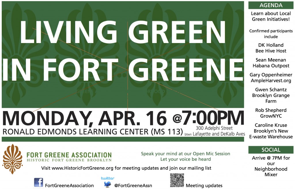 The Fort Greene Association is devoted to historic preservation, neighborhood and park enhancement, as well as cultural, economic and housing advancement throughout the neighborhood of Fort Greene, Brooklyn. The Fort Greene Association, Inc. is an all-volunteer organization, operating as a non-profit 501(c) (3) charitable organization that supports and works in concert with the many other fine organizations that make our community so special and vital. Follow us on Twitter or become our Facebook Fan.